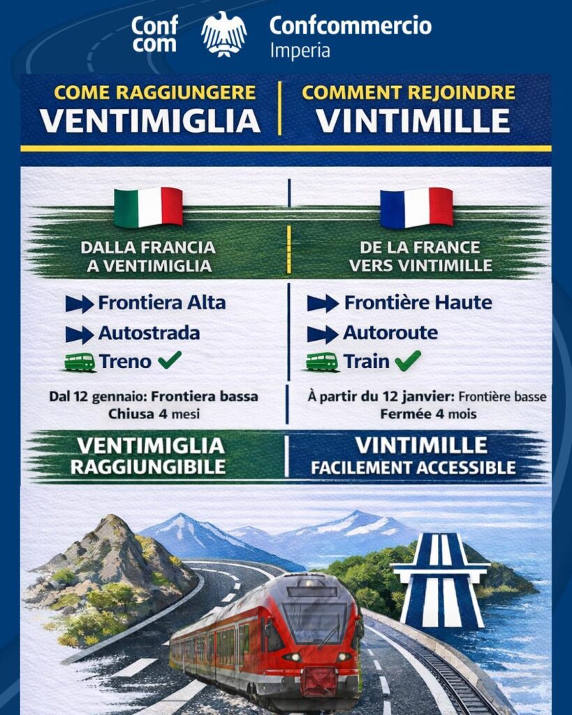La Confcommercio si è attivata fin dal dicembre scorso per le modifiche alla viabilità legate ai lavori al valico di frontiera di Ponte San Ludovico, a Ventimiglia. I lavori riguarderanno inizialmente piazzale De Gasperi, poi le gallerie “Balzi Rossi” e “Dogana” e infine la rotatoria di Latte. Nel corso di una riunione a Genova con i vertici Anas era stata accolta l’istanza di Confcommercio di posticipare l’intervento dopo le festività natalizie.